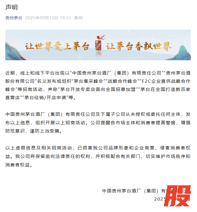 茅台集团:未授权或委托任何主体发布或组织“茅台集采峰会”等招商活动茅台集团:未授权或委托任何主体发布或组织“茅台集采峰会”等招商活动