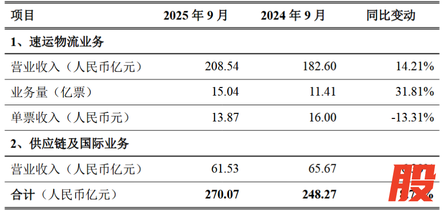 10月17日,顺丰控股(002352/06936)发布公告,2025年9月,公司速运物流业务营业收入209亿元,同比增长14.21%,业务量15亿票,同比增长31.81%,单票收入13.87元,同比下降13.31%,具体如下: